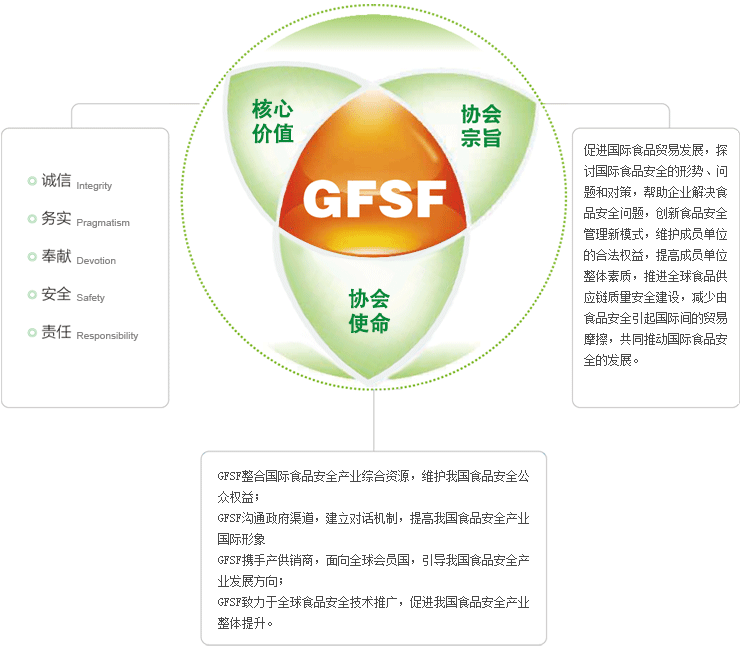 国际食品安全协会(Global Food Safety Forum, GFSF)是在美国注册成立的非营利性食品及相关行业公益性社会团体,是世界卫生组织、国际粮农组织、国际食品法典委员会合作单位,总部设在美国华盛顿。